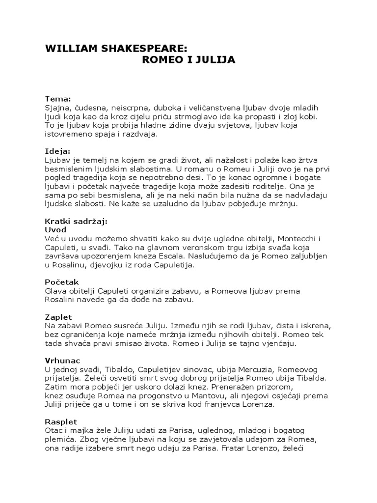 Romeo I Julija Viljem Sekspir Analiza Prepricano Lektira